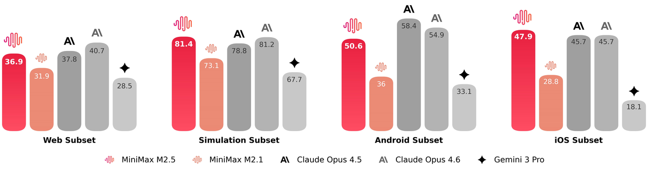 A significant improvement from previous generations is M2.5's ability to think and plan like an architect. The Spec-writing tendency of the model emerged during training: before writing any code, M2.5 actively decomposes and plans the features, structure, and UI design of the project from the perspective of an experienced software architect. M2.5 was trained on over 10 languages (including Go, C, C++, TypeScript, Rust, Kotlin, Python, Java, JavaScript, PHP, Lua, Dart, and Ruby) across more than 200,000 real-world environments. Going far beyond bug-fixing, M2.5 delivers reliable performance across the entire development lifecycle of complex systems: from 0-to-1 system design and environment setup, to 1-to-10 system development, to 10-to-90 feature iteration, and finally 90-to-100 comprehensive code review and system testing. It covers full-stack projects spanning multiple platforms including Web, Android, iOS, and Windows, encompassing server-side APIs, business logic, databases, and more, not just frontend webpage demos. To evaluate these capabilities, we also upgraded the VIBE benchmark to a more complex and challenging Pro version, significantly increasing task complexity, domain coverage, and evaluation accuracy. Overall, M2.5 performs on par with Opus 4.5.
