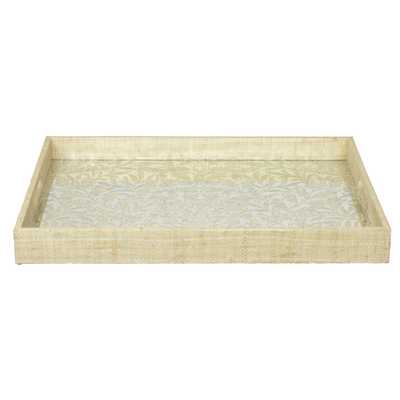 A plain, empty bamboo tray with a textured surface and a simple, rectangular shape.