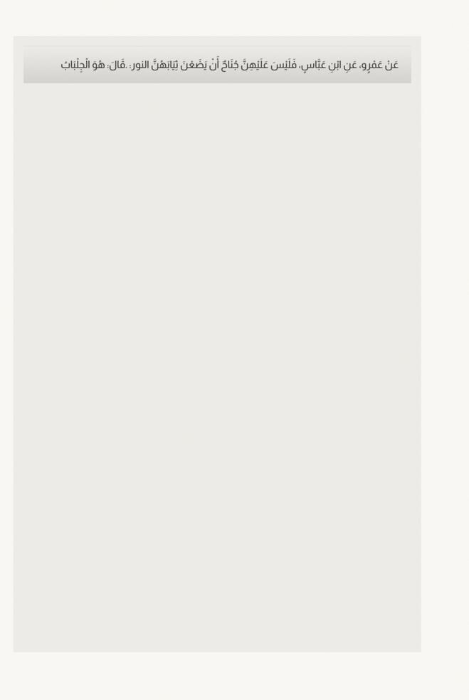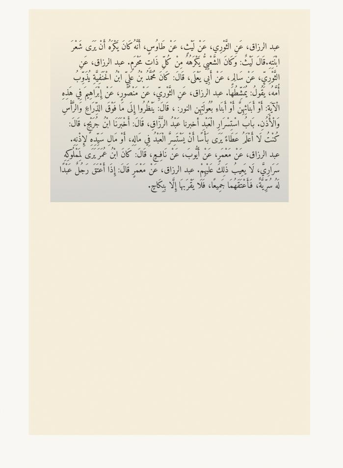 ูุง ูููููู ุงูุฐููุฑูุงุนู ููุงูุฑููุฃูุณู ููุงููุฃูุฐููู. ุจูุงุจู ุงุณูุชูุณูุฑูุงุฑู ุงููุนูุจูุฏู ุฃุฎุจุฑูุง ุนูุจูุฏู ุงูุฑููุฒููุงููุ ููุงูู: ุฃูุฎูุจูุฑูููุง ุงุจููู ุฌูุฑูููุฌูุ ููุงูู: ููููุชู ููุง ุฃูุนูููู